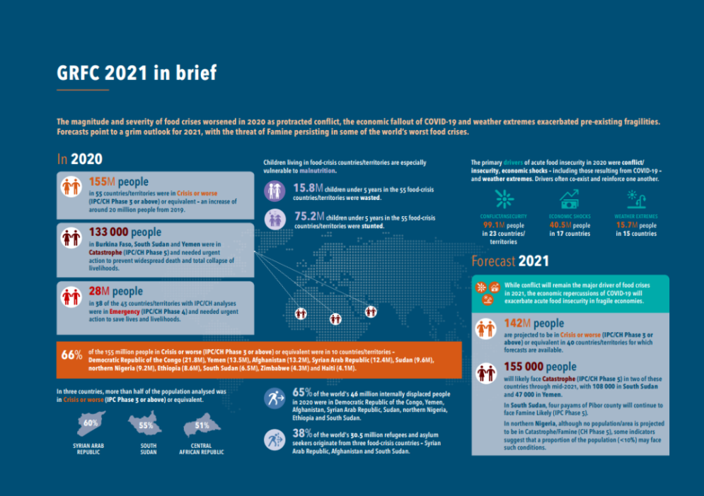不久前,联合国粮农组织、世界粮食计划署和欧盟共同在线发布了《2021年全球粮食危机报告》。报告显示,在受粮食危机困扰的国家中,面临突发性粮食不安全状况的人数,2020年已达过去5年的最高水平:1.55亿人。