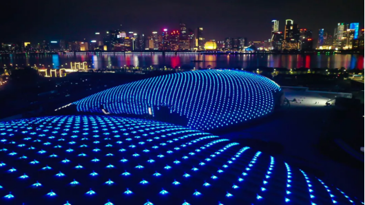 杭州奥体中心体育游泳馆包含两个场馆:体育馆、游泳馆。双馆合一的设计理念承载的是节能高效的追求。在注重实用性的同时,场馆还兼顾了美的体验。独特的流线造型,结合双层全覆盖银白色金属屋面,和两翼张开的平台形式。晚上亮灯时,它还有一个特别好听的别名——“银河幻影”。