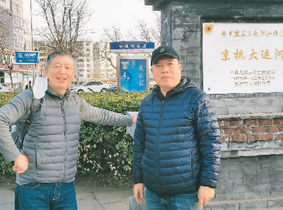 孙绍坛(右)始终生活在天津南运河边。他兴奋地带着本报记者,看大运河两岸的变迁。 刘 晓摄