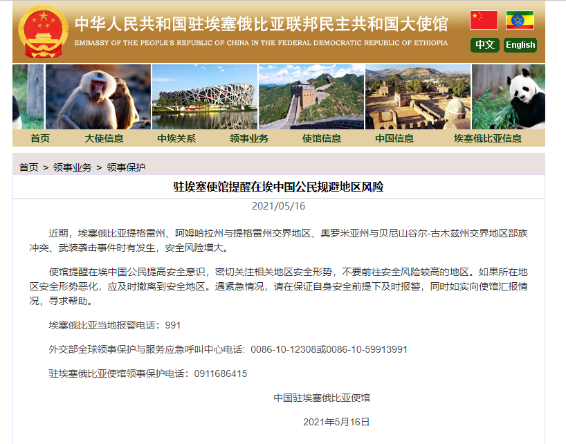海外网5月17日电 据中国驻埃塞俄比亚大使馆官网消息,近期,埃塞俄比亚提格雷州、阿姆哈拉州与提格雷州交界地区、奥罗米亚州与贝尼山谷尔-古木兹州交界地区部族冲突、武装袭击事件时有发生,安全风险增大。