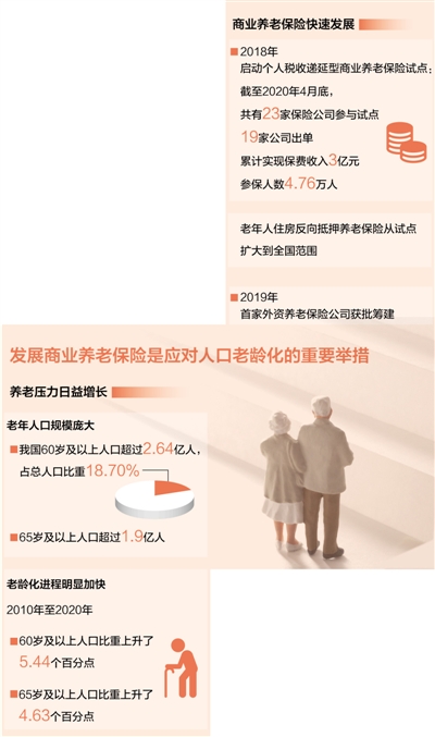 记者了解到,2017年国务院办公厅印发《关于加快发展商业养老保险的若干意见》以来,我国商业养老保险持续健康发展。“近几年‘第三支柱’的发展取得了较好成果。”北京工商大学保险研究中心主任王绪瑾介绍,比如2018年启动了个人税收递延型商业养老保险试点,明确保费支出可以延迟缴纳个税,来鼓励个人购买商业养老保险产品。截至2020年4月底,共有23家保险公司参与试点,19家公司出单,累计实现保费收入3亿元,参保人数4.76万人。