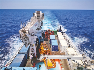 “海牛Ⅱ号”搭载科考船驶向深海。湖南科技大学供图