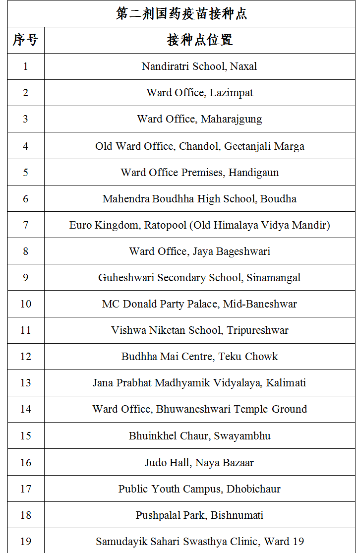 海外网5月17日电 据中国驻尼泊尔使馆网站15日消息,根据尼泊尔政府统一安排,尼方将于5月16日起在加德满都启动第二剂中国国药新冠疫苗接种。鉴于加德满都实施封城禁令,并为防范聚集感染风险,经我馆与尼方协调,请已接种第一剂国药疫苗的在加都中国公民,参考尼方推荐的接种日期(见附件一),携带第一剂疫苗接种凭证及有效身份证件,自行就近前往尼方指定接种点(见附件二),完成第二剂国药疫苗接种。加都以外地区的中国公民请等待尼方进一步安排。请注意以下事项: