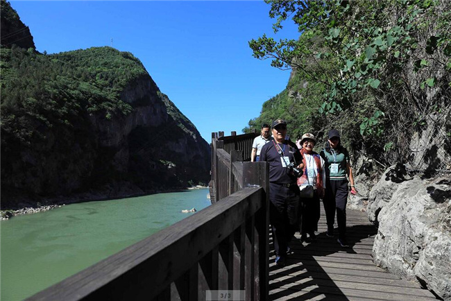 四川广元,海外华文媒体代表走在明月峡景区的古栈道上。王磊 摄