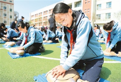 4月28日,“健康甘肃——意外伤害自我救护能力提升项目”走进甘肃省兰州市华侨实验学校,给广大师生普及急救知识,现场演示并培训心肺复苏、止血包扎等急救技能,强化师生安全意识,提高师生应急自救互救能力。 图为该校学生练习急救技能。 新华社记者 马希平摄