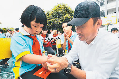 “德国华商贵州公益行”在拉干小学捐资助学时,范轩(左)向学生赠送礼物。 杨晓海摄