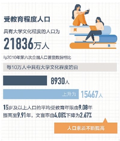 ——劳动年龄人口中,高中及以上受教育程度的人口占比43.79%,比“六人普”提高了12.8个百分点