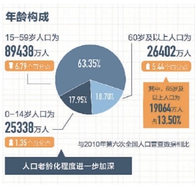 从第七次全国人口普查数据来看,中国60岁及以上人口有2.6亿人,占总人口比重达到18.70%,较2010年上升了5.44个百分点。其中,65岁及以上人口1.9亿人,比重达到13.50%,上升了4.63个百分点。