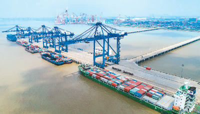 5月17日,江苏南通通海港区集装箱码头,大型机械正在吊装货物。 翟慧勇摄(人民图片)