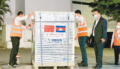 3月31日,工作人员在柬埔寨金边国际机场搬运中国援柬新冠疫苗。 高炳南摄(新华社发)