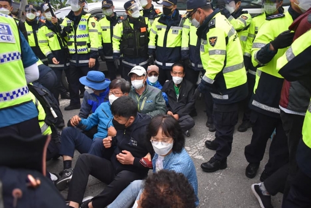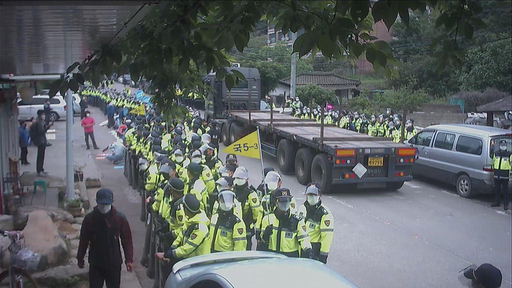 韩国国防部曾于4月28日、5月14日和18日动员数十辆车辆,将物资运入基地内,期间均与抗议民众发生对峙,有部分民众受伤。(海外网 刘强)
