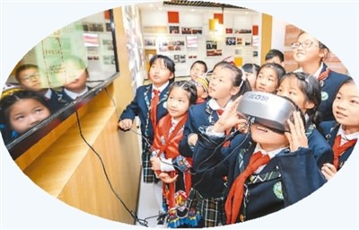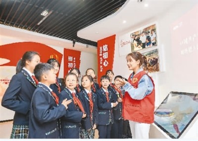 学生们在志愿者的讲解下体验智慧党课。