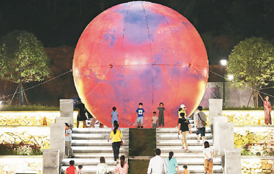 5月15日,“祝融号”火星体验馆在湖南衡阳南岳区开馆,体验馆展出了中国首辆火星车“祝融号”模型,通过“祝融号”发展历程科普、沉浸式火星场景体验、宇航服穿戴体验等形式,向游客普及“祝融号”相关知识。图为“祝融号”火星体验馆外的红色“火星球”吸引游客拍照打卡。 罗茂盟摄(人民图片)