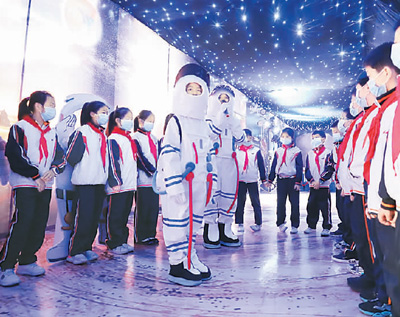 5月18日,湖南衡阳南岳完小的同学们在“祝融号”火星体验馆,参观体验太空服的穿戴。 曹正平摄(人民图片)