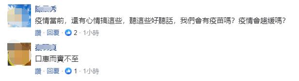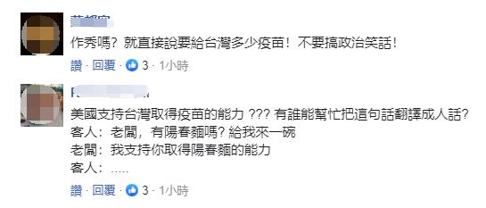 “作秀吗?就直接说要给台湾多少疫苗!不要搞政治笑话!”