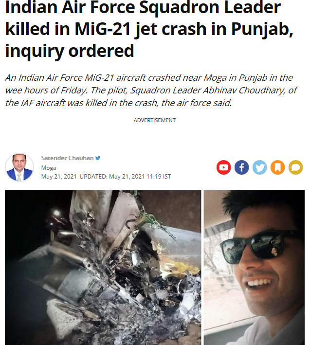印度空军表示,事故发生时,这架飞机正进行例行飞行训练。该飞机飞行员、空军中队长阿比纳夫·乔杜里在坠机中丧生。印度空军正在调查坠机原因。印媒表示,这是印度2021年第三起米格-21战机坠毁事故。(海外网 张琪)