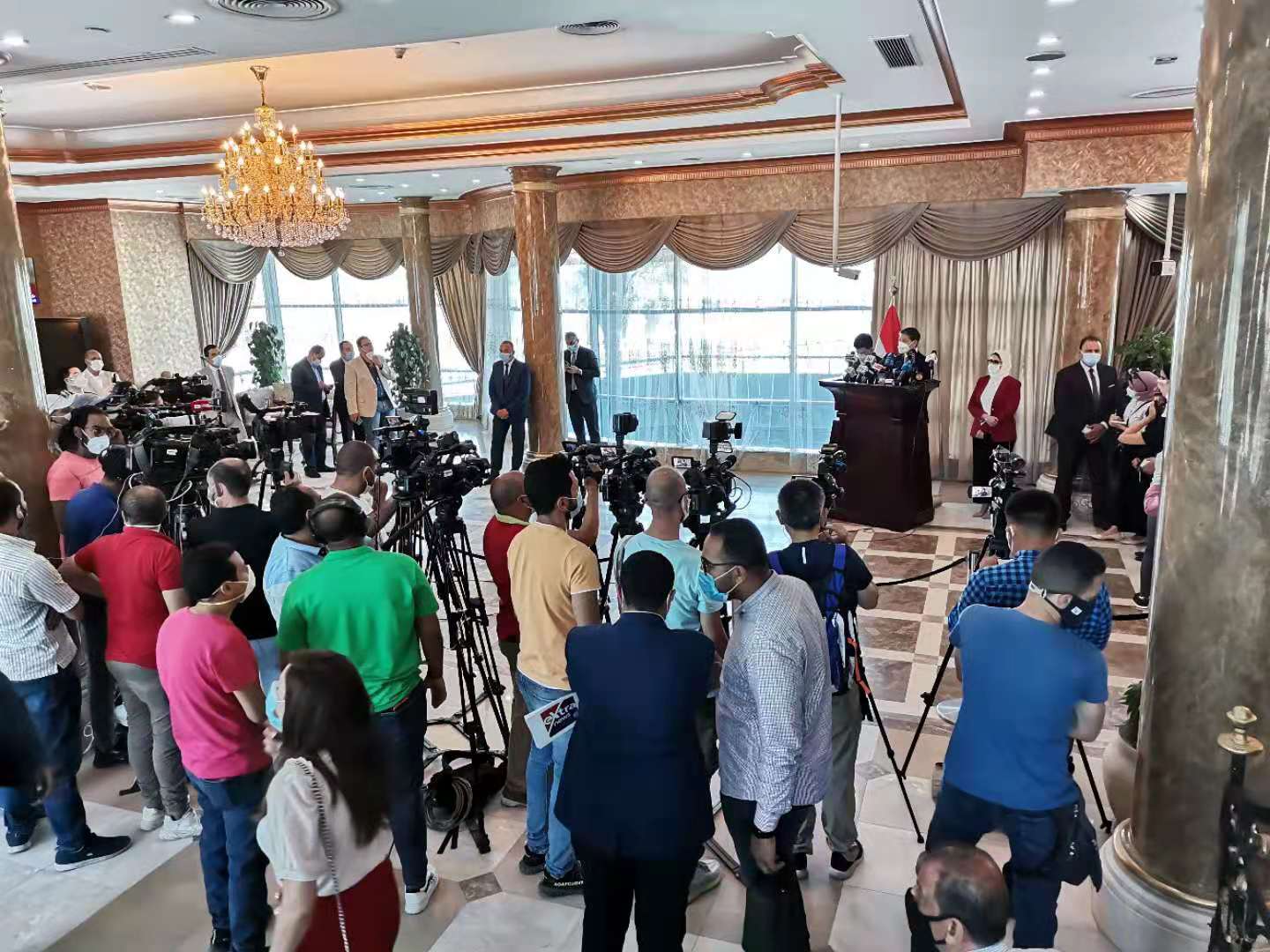 埃及卫生部长哈莱在发布会上讲话 摄影:新华社开罗分社 隋先凯