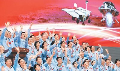 5月15日,航天科研人员在北京航天飞行控制中心指挥大厅庆祝我国首次火星探测任务着陆火星成功。