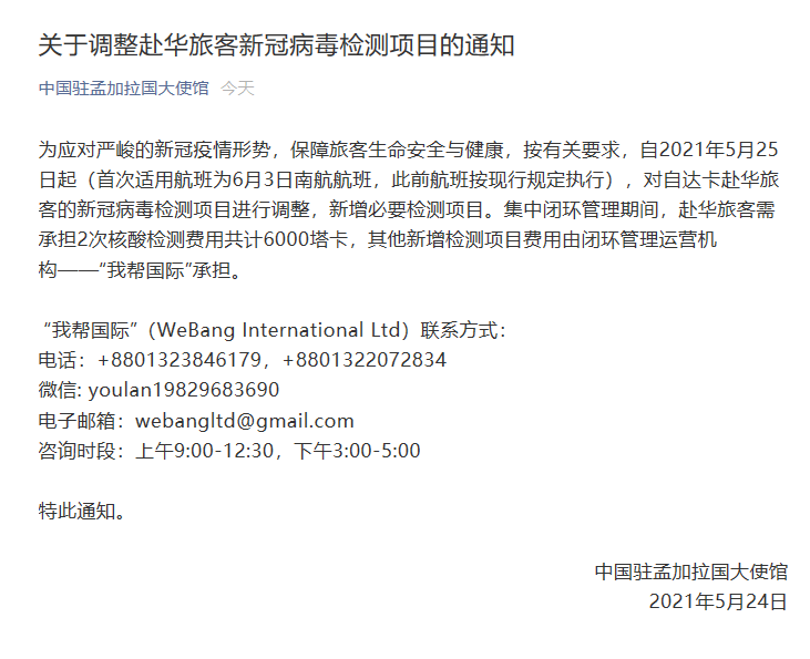 海外网5月24日电 据中国驻孟加拉国大使馆官方微信,为应对严峻的新冠疫情形势,保障旅客生命安全与健康,按有关要求,自2021年5月25日起(首次适用航班为6月3日南航航班,此前航班按现行规定执行),对自达卡赴华旅客的新冠病毒检测项目进行调整,新增必要检测项目。集中闭环管理期间,赴华旅客需承担2次核酸检测费用共计6000塔卡,其他新增检测项目费用由闭环管理运营机构——“我帮国际”承担。