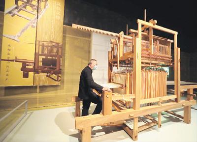 工作人员在复原的汉代提花机上演示织锦。