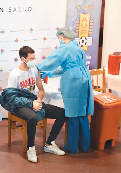 5月6日,乌拉圭甲级联赛球员在首都蒙得维的亚百年纪念体育场内接种首剂中国科兴新冠疫苗。该批疫苗由北京科兴中维生物技术有限公司捐赠。尼古拉斯·塞拉亚摄(新华社发)