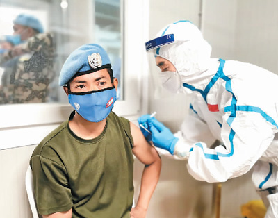 5月17日,中国赴黎维和医疗队医务人员为联合国驻黎巴嫩临时部队官兵接种新冠疫苗。贾方文摄(人民视觉)