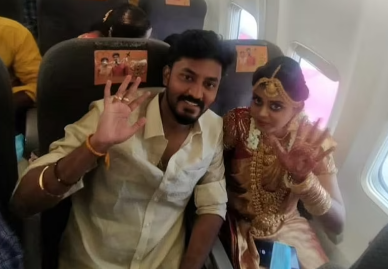 据《每日邮报》24日消息称,泰米尔纳德邦目前正处于封锁限制之下,规定婚礼人数不能超过50人。因此这对夫妇选择在飞机上完成婚礼,以便邀请160余位亲朋好友参加。拉凯什和达希娜在印度香料航空公司预定了一架从泰米尔纳德邦马杜赖市起飞的包机。婚礼现场的视频和照片随即被上传到社交媒体上,飞机上几乎无人佩戴口罩,场面一片混乱,人们向镜头展示脖子上戴的鲜花并拍照留念。