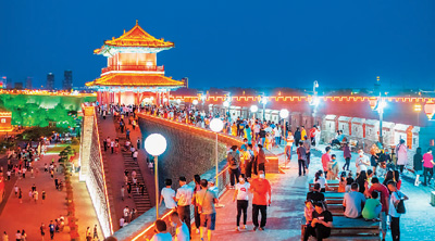 河北省石家庄市正定县,古城南城门游客络绎不绝,登古城、赏夜景,正定已成为周边群众休闲旅游的好去处。