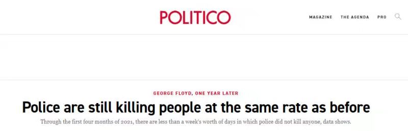 美国政治新闻网站Politico注意到,与去年的每日平均值相比,今年每天约有三人在警察执法过程中死亡。在今年的前四个月中,只有六天的时间并没有人在警察执法过程中死亡。这提醒人们,弗洛伊德在明尼阿波利斯遇难以来的一年中,尽管发生了疫情以及对执法行为的严格审查,但没有带来多大改变。