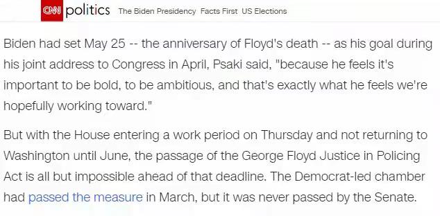 据悉,这项由弗洛伊德名字命名的法案由民主党掌控的国会众议院于2020年6月表决通过,随后在参议院频频受阻。美国有线电视新闻网(CNN)23日称,拜登原本希望在弗洛伊德去世一周年之内通过这一法案,但该立法目前处于停滞状态,几乎不可能按时获得通过。