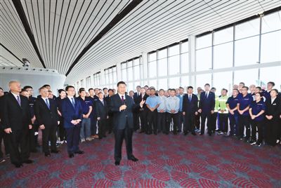 大兴机场航站楼,是目前全球最大规模的单体航站楼,以其独特的造型设计、精湛的施工工艺、便捷的交通组织、先进的技术应用,创造了许多世界之最。航站楼里,流线型的空间结构十分宽敞明亮。习近平步行巡览站台大厅和值机大厅,实地了解值机、安检、登机和残疾人无障碍设施等情况,并结合沙盘和模型听取机场总体规划、设施建设等介绍。习近平强调,大兴国际机场是首都的重大标志性工程,是推动京津冀协同发展的骨干工程。京津冀三地要抓住机遇加强协同合作,加快推动地区高质量发展。民航业是国家重要的战略产业。要建设更多更先进的航空枢纽、更完善的综合交通运输系统,加快建设交通强国。