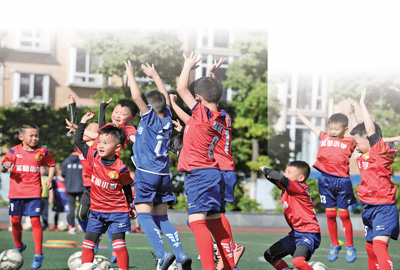 贵州省仁怀市实验小学,小学生球员在足球训练对抗赛胜利后欢呼雀跃。 陈 勇摄
