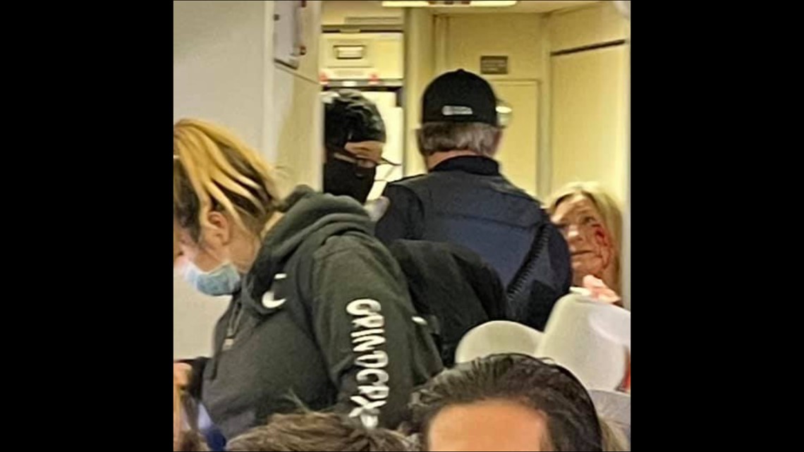 现场画面显示,一位女乘客站起来对空姐挥拳猛击,被一名男子出面制止,飞机上尖叫不断。空姐头发凌乱、满脸是血,最后被人用轮椅推着离开。(海外网 刘强)