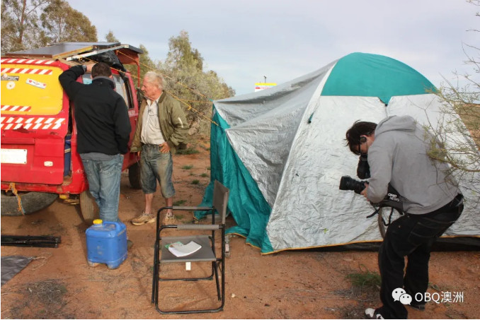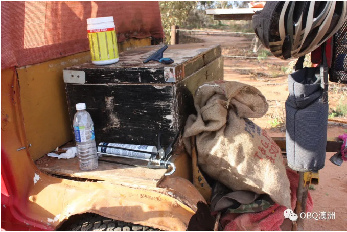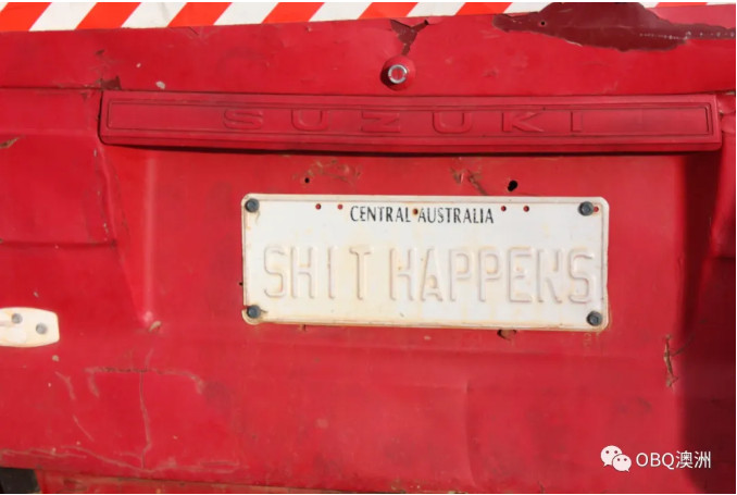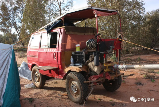 Klaus Mezel的Hilux红色车是他在Barrow Creek找到的。改装后的房车车顶上还有太阳能板,所蓄积的电用来作为冰箱和电脑的用电。房车车牌写着“Shit Happers”。