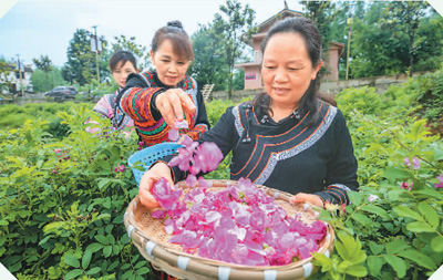 5月21日,贵州省毕节市金海湖新区响水乡青山村村民正在采收食用玫瑰花。罗大富摄(人民视觉)