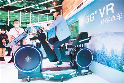 贵州是全国首个大数据综合试验区,“大数据”为贵州经济发展、政府治理、对外开放注入了新活力,也给当地民众生产、生活方式带来了改变。图为5月27日,在2021中国国际大数据产业博览会展馆,观众在体验5G虚拟现实动感单车。新华社记者 金立旺摄