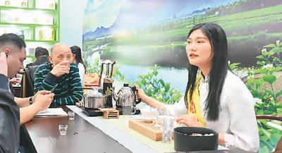 3月18日,首届中国跨境电商交易会在福建省福州市举行。一家茉莉花茶企业工作人员(右)在向客人介绍福州的茉莉花茶。新华社记者 林善传摄