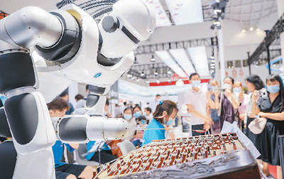 5月9日,首届消博会上的“海百合”智能音乐机器人正在用扬琴演奏中国古典民乐,引来观众驻足。张武军摄(人民视觉)