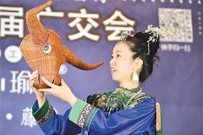 4月13日,贵州省黔东南苗族侗族自治州榕江县一位参加广交会的企业营销人员在直播平台试播时展示自己的藤编产品。王炳真摄(人民视觉)