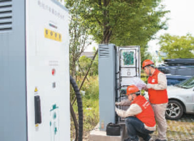 在江苏省海安市曲塘镇一国网充电点,技术人员对新装的充电桩进行调试。翟慧勇摄(人民图片)
