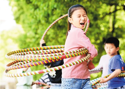 5月7日,湖南省郴州市嘉禾县塘村中心学校,学生在课间练习呼啦圈。黄春涛摄(人民图片)