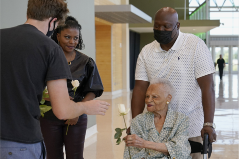 美国俄克拉荷马州塔尔萨市,现年107岁的最年长幸存者维奥拉弗莱彻手持白色玫瑰出席幸存者纪念仪式