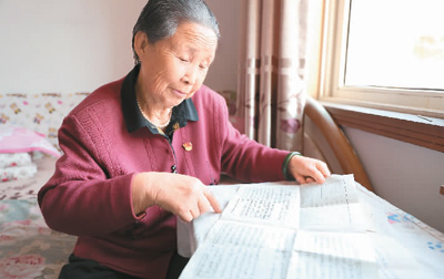唐玉花老人正在翻看自己的简历。资料图片
