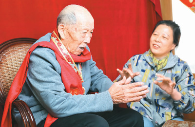 96岁老党员万兆滋(左)在唱红歌。资料图片