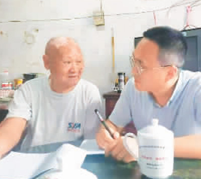 退役军人服务站工作人员日前到王锡文(左)家走访。肖 昀摄