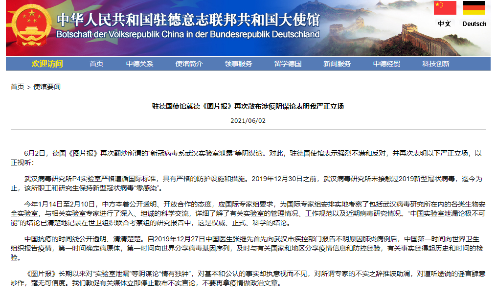 德媒再次散布涉疫阴谋论 中国驻德使馆再表严正