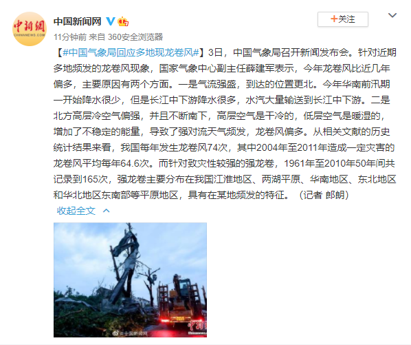 3日,中国气象局召开新闻发布会。针对近期多地频发的龙卷风现象,国家气象中心副主任薛建军表示,今年龙卷风比近几年偏多,主要原因有两个方面。一是气流强盛,到达的位置更北。今年华南前汛期一开始降水很少,但是长江中下游降水很多,水汽大量输送到长江中下游。二是北方高层冷空气偏强,并且不断南下,高层空气是干冷的,低层空气是暖湿的,增加了不稳定的能量,导致了强对流天气频发,龙卷风偏多。从相关文献的历史统计结果来看,我国每年发生龙卷风74次,其中2004年至2011年造成一定灾害的龙卷风平均每年64.6次。而针对致灾性较强的强龙卷,1961年至2010年50年间共记录到165次,强龙卷主要分布在我国江淮地区、两湖平原、华南地区、东北地区和华北地区东南部等平原地区,具有在某地频发的特征。(记者 郎朗)