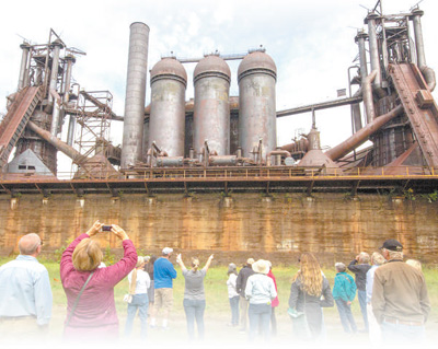 在美国匹兹堡,人们参观原炼铁厂高炉遗存。 资料图片