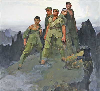 詹建俊1959年创作的油画《狼牙山五壮士》,是表现英雄人物的一次成功探索。作品并未刻画激烈的战斗场面,而是选择了跳崖前一瞬间勇士们视死如归的悲壮场景。画家用与山石相近的色调、大刀阔斧的笔触塑造人物,人物组合的外轮廓亦似巍峨的山巅,与群山相呼应,象征五壮士的精神如高山般伟大。