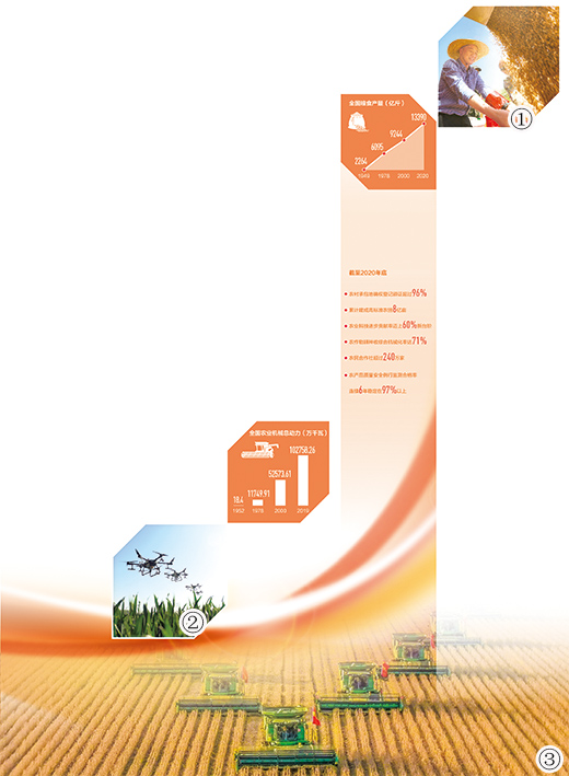 图①:安徽省淮北市烈山区烈山镇青谷村,农户趁着晴好天气抢收小麦,确保颗粒归仓。冯树风摄(人民视觉)图②:河南省夏邑县会亭镇张桥村,植保无人机进行飞防作业。王高超摄(人民视觉)图③:黑龙江北大荒农垦集团鹤山农场秋收作业场景。岳静华摄 数据来源:国家统计局、农业农村部